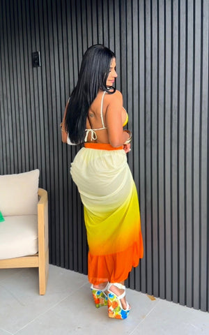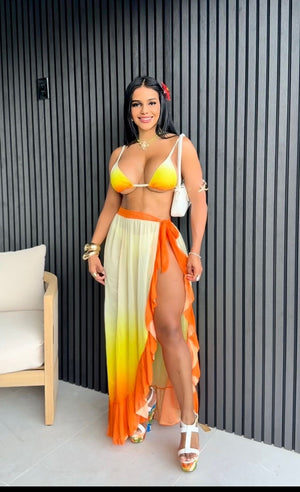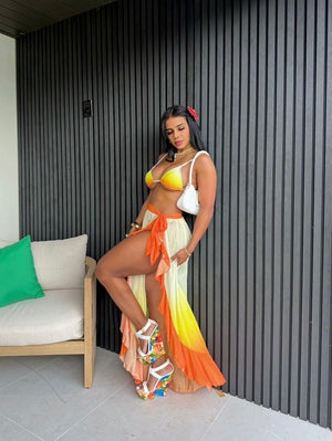 Este conjunto de dos piezas, ideal para coquetear, incluye un top de bikini con un atractivo degradado de color y una falda con volantes que se mueve contigo, desde los brunchs en la playa hasta los cócteles en la azotea.