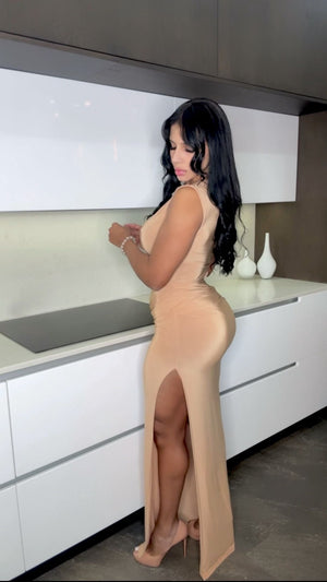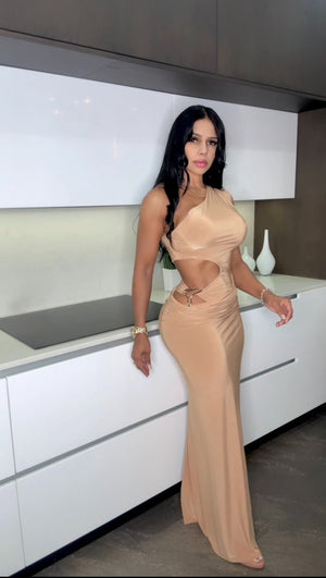 Sumérgete en la elegancia sin esfuerzo con nuestro vestido Sahara Siren: una silueta sensual que susurra confianza y cautiva la atención. Confeccionado en un rico tono nude, este diseño de un solo hombro presenta recortes laterales esculpidos adornados con detalles dorados, mientras que una abertura hasta el muslo añade un toque seductor. Ideal para veladas al atardecer, eventos en azoteas o noches exclusivas.