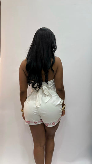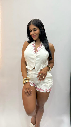 Conjunto de lino blanco con bordados florales fucsia en el escote y el dobladillo. Su diseño de cuello halter con cierre en la espalda y corte entallado realza la figura con un look fresco, femenino y sofisticado. Ideal para noches de verano, escapadas costeras o eventos bajo el sol.