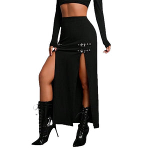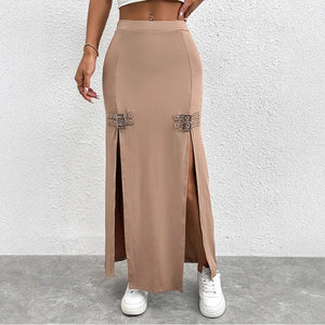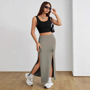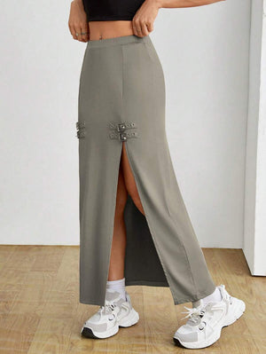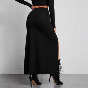 Falda tubo de calle, corte ajustado y abertura lateral alta.