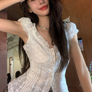 Sleeves: Short bubble sleeves add a touch of elegance and volume to the silhouette.