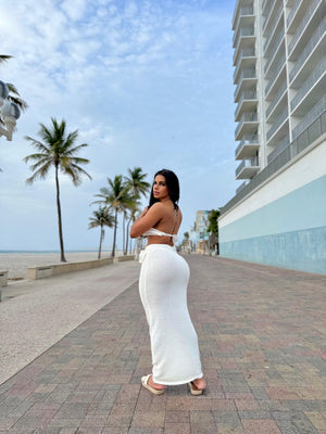 Look like a tropical goddess in this white two-piece set.The bandeau-style top with a decorative flower pairs perfectly with the high-waisted maxi skirt, highlighting your curves with elegance and freshness.Perfect for the beach, resort getaways, or a tropical brunch. A look that screams relaxed luxury and Caribbean glow.