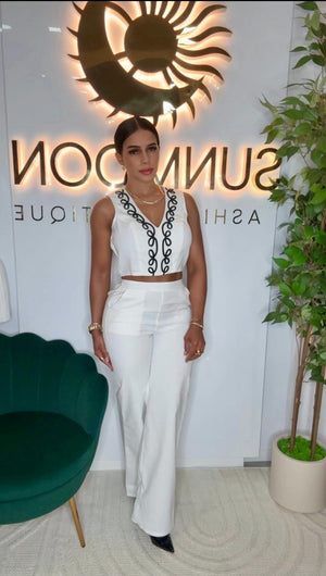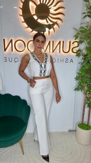 Step into sophistication with this elegant two-piece ivory set featuring a sleeveless crop top with black embroidered detailing and high-waisted tailored trousers. Perfect for elevated brunch looks, networking events, or any moment you want to stand out with class.