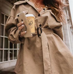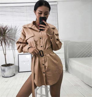 Design & Style: Oversized shirt-dress with a belted waist, long puffed sleeves, and utility-style chest pockets for a chic, structured look.