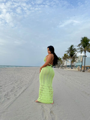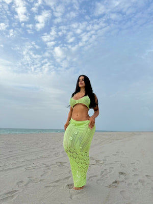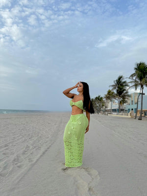 Turn heads this summer with the Playa Bonita Set, a handmade-inspired crochet two-piece that hugs your curves while keeping it breezy. The lime green pop adds tropical energy, making it the perfect cover-up for beach days or poolside lounging. Soft stretch, semi-sheer, and statement-ready.