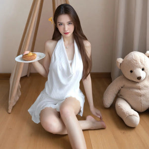 Design: Chic white halter dress in a fake two-piece design for a modern layered look