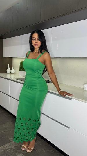 The Verde Valencia Dress hugs every curve with soft, flattering structure, while the laser-cut floral hem adds a playful, upscale twist. With thick straps and a structured bust, this green beauty gives confident elegance — perfect for the woman who knows her presence is a gift.