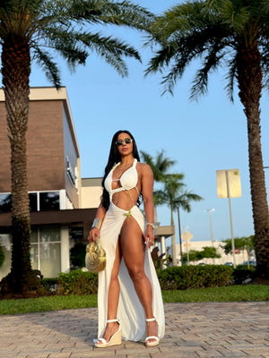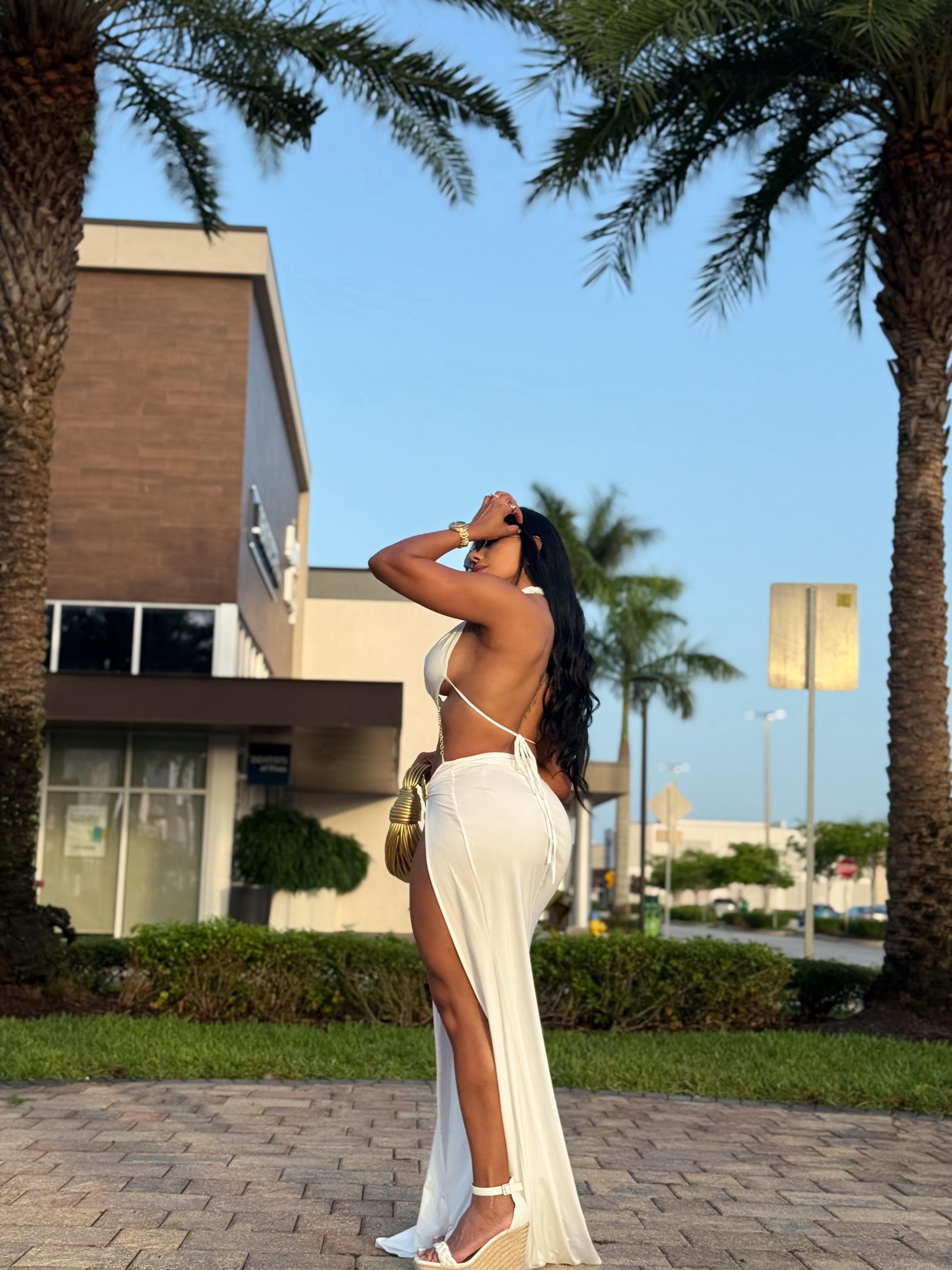 High-cut summer dress with an open back. Made to stand out with tropical elegance. Perfect for warm evenings and luxurious getaways.