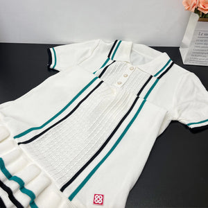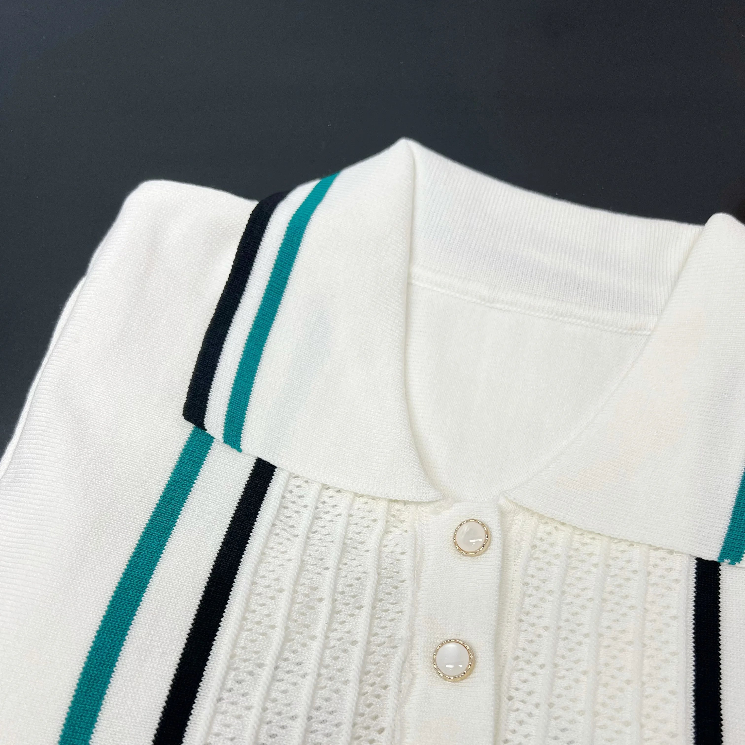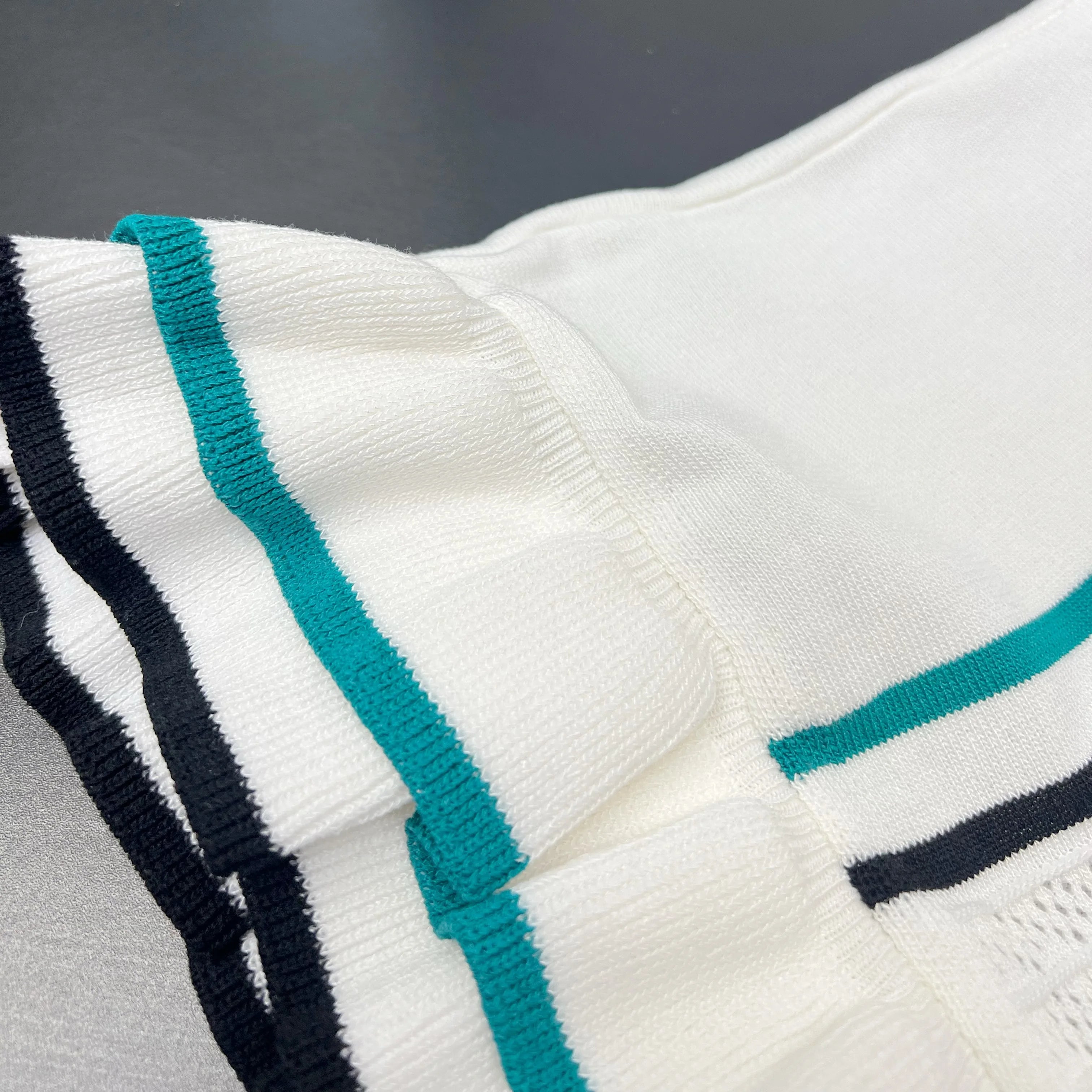 Ruffled Knit Fabric: Medium-stretch knitted material with ruffle detailing adds texture and feminine flair.